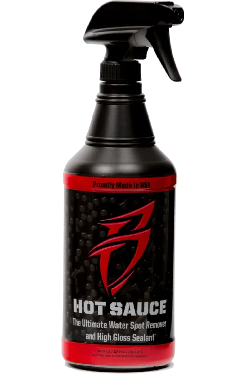 Bling Sauce’s #1 selling product, Hot Sauce, is a spray detailer on steroids. The unique spray-on, wipe-off formula has the strength to cut through hard water spots WITHOUT stripping your wax. Hot Sauce contains sealants to help maintain your wax coat while leaving a streak-free, show quality shine.