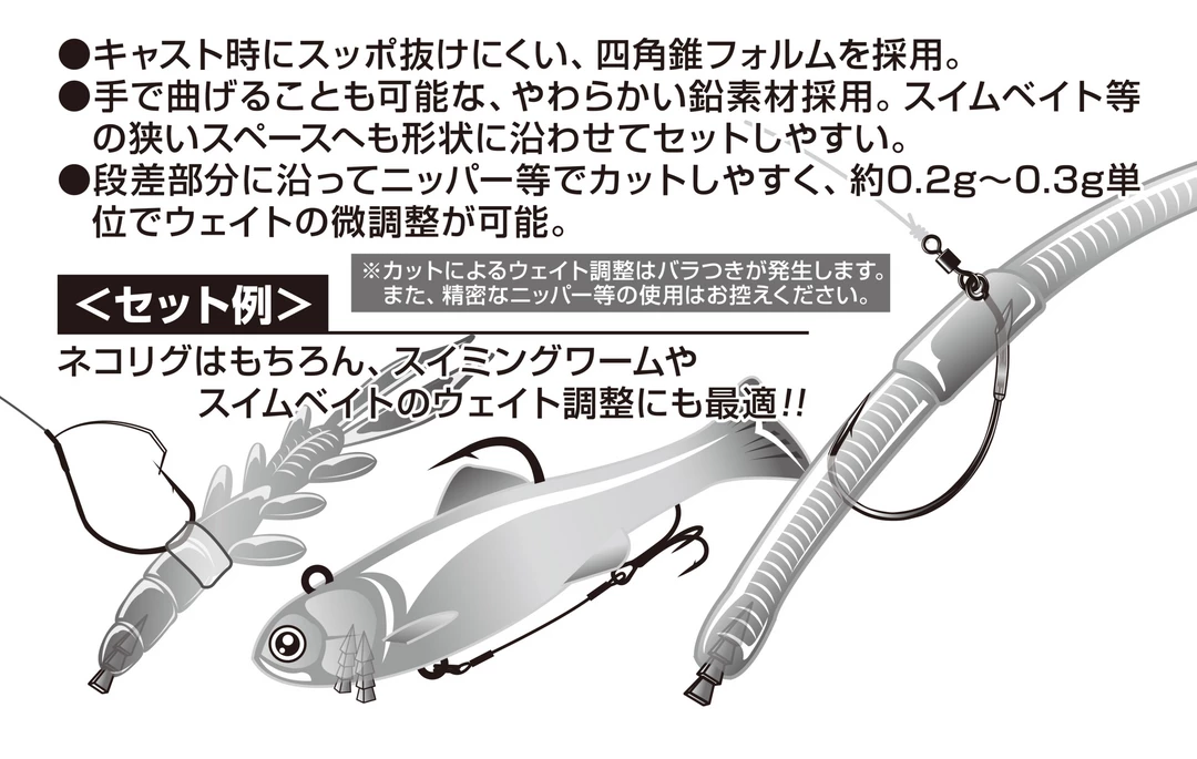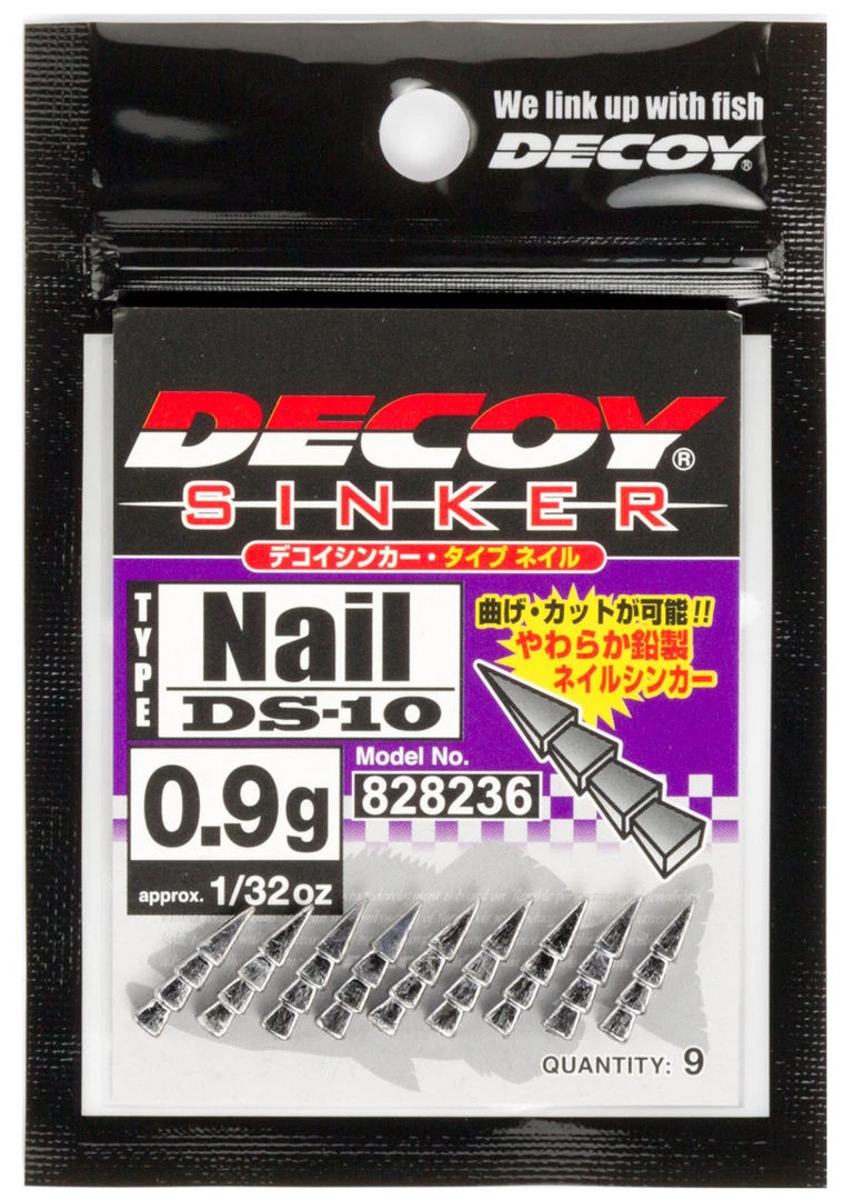 An excellent tool to quickly and easily customize your favorite soft plastic. The Decoy Nail Sinkers are the perfect way to adjust your baits rate or orientation of fall. Not only are they ideal for pairing with your preferred Neko and Wacky worms, but they are also a smart way to change your swimbait’s rate of fall or simply balance them. You can also add the Nail Sinkers to fluke-style baits, paddle tails, and other plastics to give them a nose-down feeding presentation that bass find irresistible. Designed with a sharp point for easy insertion and hard ridges to prevent them from flinging out on the cast, the Decoy Nail Sinkers should always be on hand for rapid adjustments to your plastics on the water.