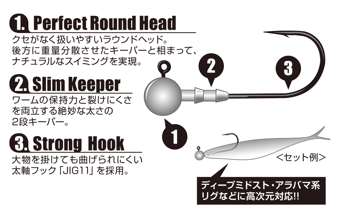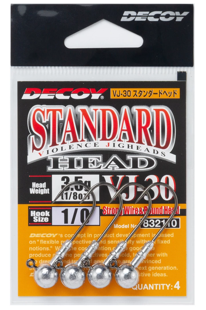 Achieving a stable swimming motion from its perfectly rounded head and two-stage bait keeper, the Decoy VJ-30 Standard Ball Head holds plastics firmly in place and distributes weight evenly down the shank of the hook. Made from a high-density lead compound for improved sensitivity, this all-purpose finesse ball head is great for dragging bottom or swimming small swimbaits and grubs through open water. Equipped with a small but stout NS Black coated jig hook, the Decoy VJ-30 Standard Ball Head supports heavier line and fishing tackle aimed at targeting monster bass using a finesse approach.