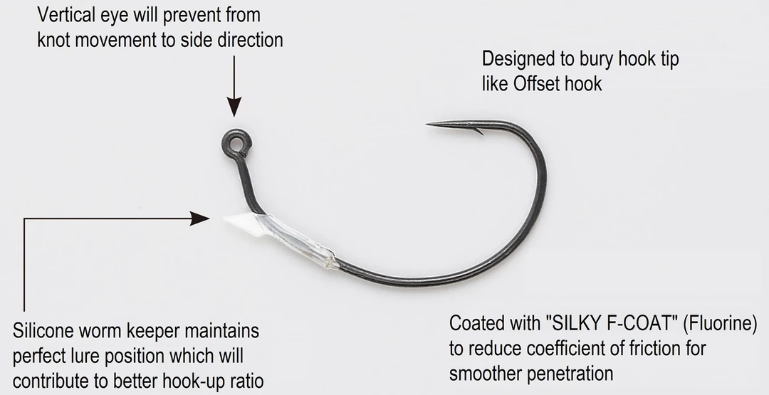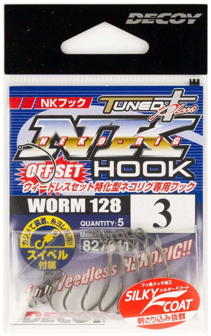 Perfect for finesse fishing, the Decoy Worm 128 Neko Rig Hook provides anglers with the ability to create a truly weedless neko rig presentation without sacrificing hook-up ratio. Built with a vertical eyelet that prevents knot movement, it also always keeps your bait perfectly inline for the best presentations possible. It features a clear shirk tube bait keeper as well, which helps provide added stealth and stops your bait from sliding down the shank of the hook while going through thick vegetation. The Decoy Neko Rig Hook also features a wide gap that provides a bigger bite for a better hook up ratio, and it’s finished with a silky coat of fluorine for lightning fast hook-sets as well. When you want to use a finesse presentation in heavy cover, the Decoy Worm 128 Neko Rig Hook provides the versatility and the power you need to get the job done.