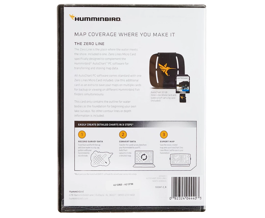 The starting point for building your own maps with AutoChart or AutoChart Live, the Humminbird AutoChart Zero Line SD Card North America is designed specifically to complement the Humminbird AutoChart PC software for transferring and storing map data. Identical to the Zero Lines card included with all AutoChart PC software, the Humminbird AutoChart Zero Line SD Card North America allows anglers to save maps on multiple cards for backup or viewing on different Humminbird fish finders simultaneously.
