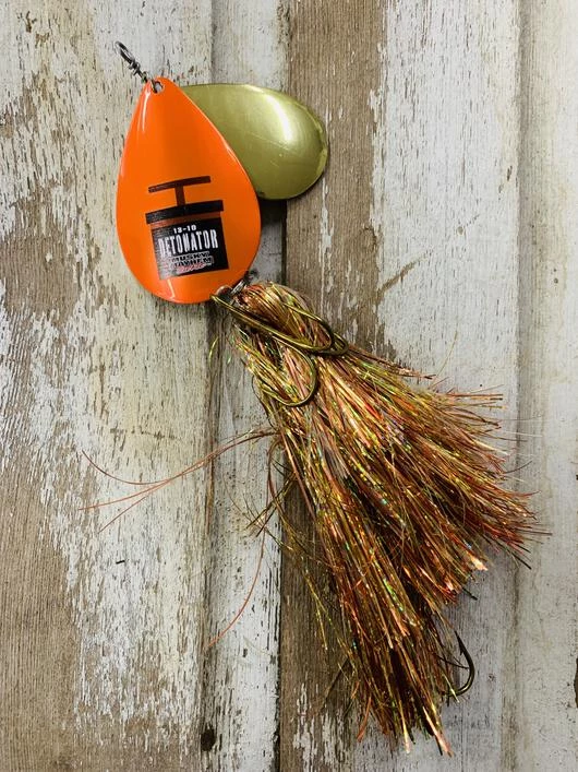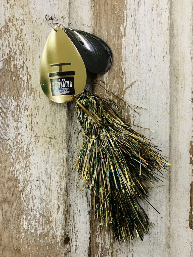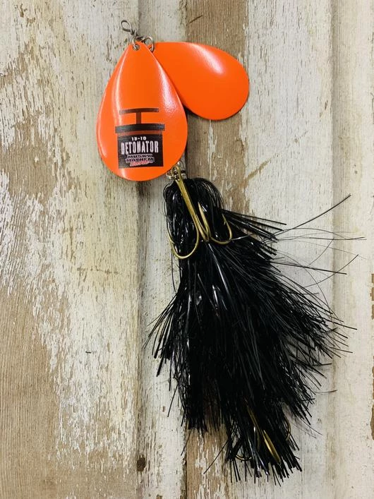 This unique bait is a double bladed combo using a #13 (exclusively made for Musky Mayhem Tackle llc) & #10 heavy blade causing a ton of wobble. It also features the same barrel under the clevises creating a grinding noise similar to the Musky Mayhem Tackle 7/9 Trigger. The Detonator is a large profile bait that make fish Detonate. Hang on!