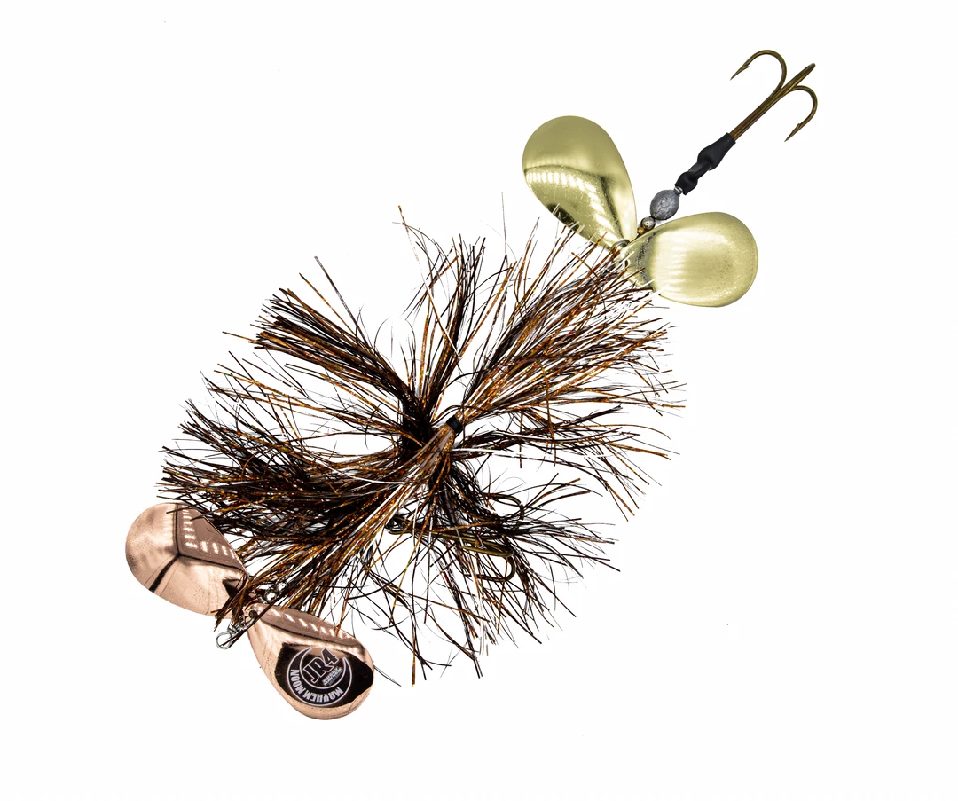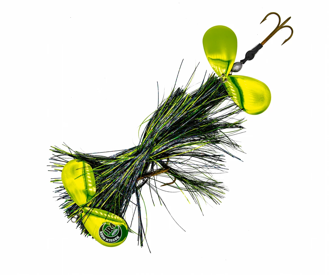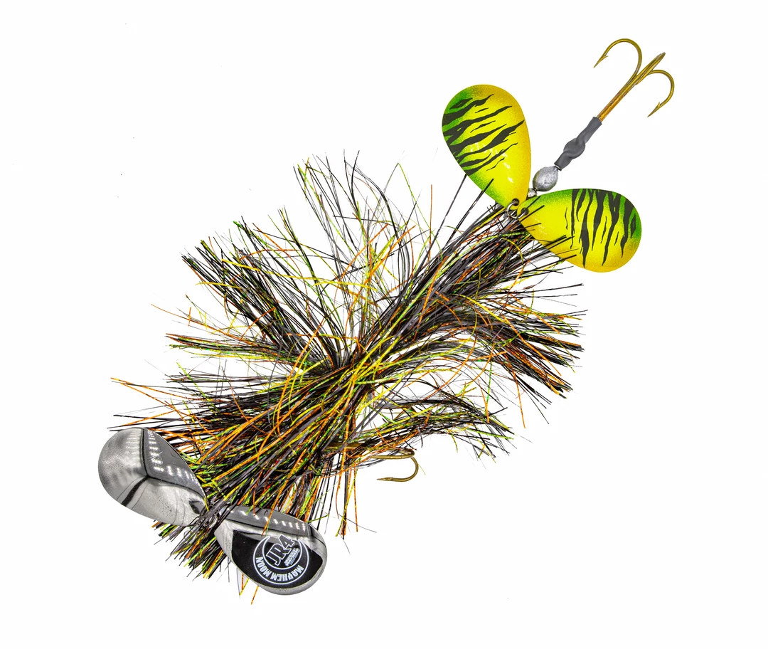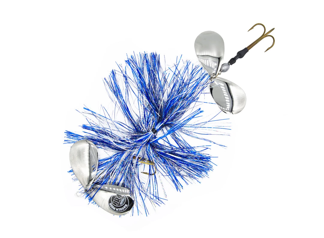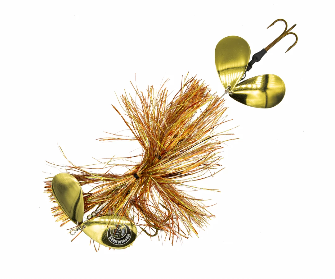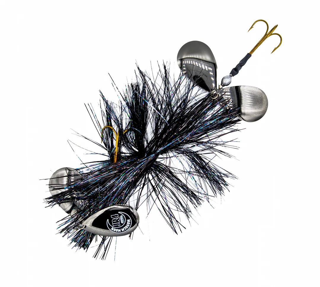With the joint effort of Todd Schulz from Musky Moon Guide Service, his son and Musky Mayhem Tackle, they have created the new Mayhem Moon product line. A exciting brand new style of bucktail featuring a jointed wire system that creates a unique tail wiggle. The front blades vacuum up the skirts while the rear blades cause additional tail wiggle and fish attracting vibration.