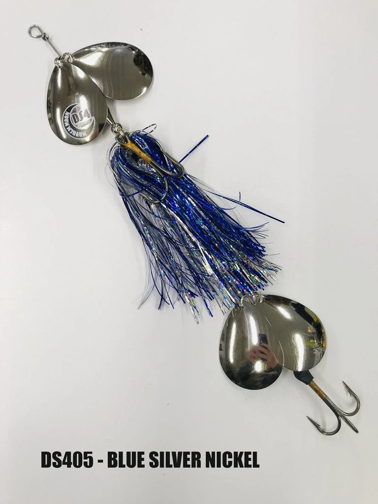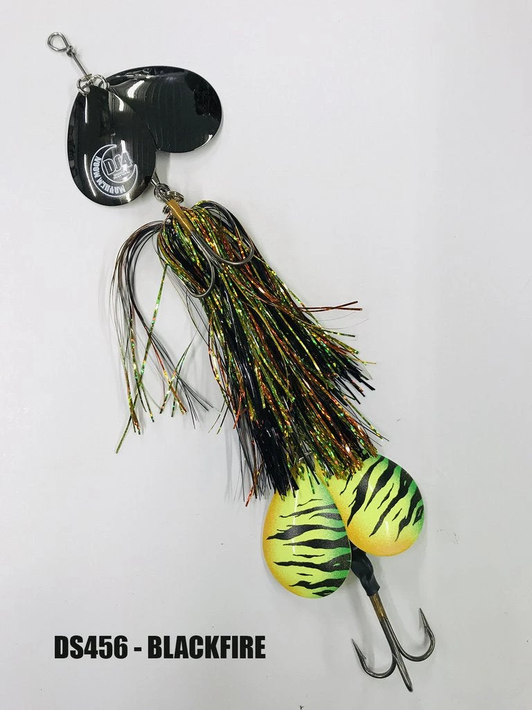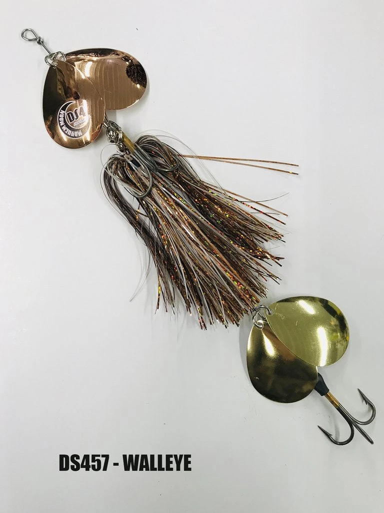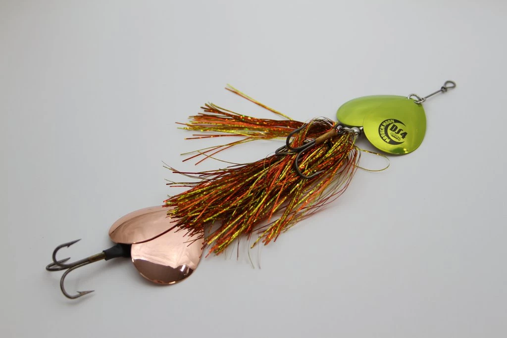 With the joint effort of Todd Schulz from Musky Moon Guide Service, his son and Musky Mayhem Tackle, they have created the new Mayhem Moon product line. A exciting brand new style of bucktail featuring a jointed wire system that creates a unique tail wiggle. The front blades vacuum up the skirts while the rear blades cause additional tail wiggle and fish attracting vibration.