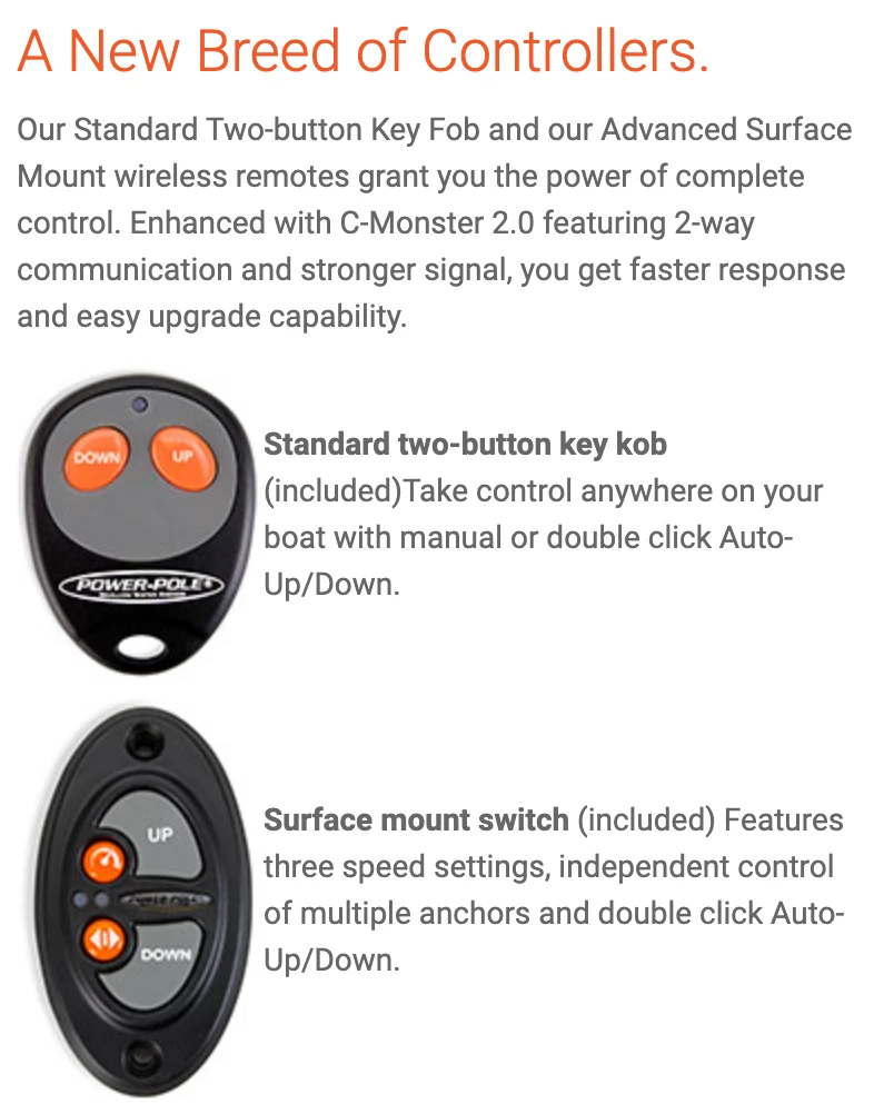 The Sportsman II deploys fast using Power Poles quietest pump. This model goes 8 feet deep, includes wireless Standard Key Fob and Advanced Surface Mount remote controls powered by C-Monster Control System. Finished with an powder coat finish for durability. The Sportsman II is easy to install so you can get out on the water faster. Includes unconditional lifetime warranty on the Everflex spike. Free C-Monster smartphone app lets you monitor your anchor settings. Available for Android and iOS.