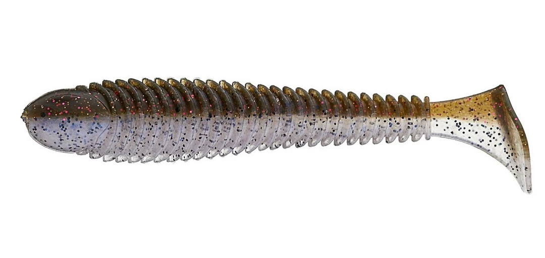 The in line ribs and below the belly boot style tail on the Saucy Swimmer are designed to grab and disperse water while swimming to give the tail an irresistible wagging kick and the body a natural wobbling motion. Use the Saucy Swimmer on a light weighted hook for shallow fish or rig it on a jig head for suspending deep fish. Sauce up a vibrating jig to amplify thumping action or use on spinnerbaits and buzzbaits for a more life like bait profile. Available is 3 different sizes and a variety of delicious colors to match the forage in your water. All googan baits are infused with Slaunch Sauce and come aligned in clam packs giving you top notch action as soon as it hits the water.