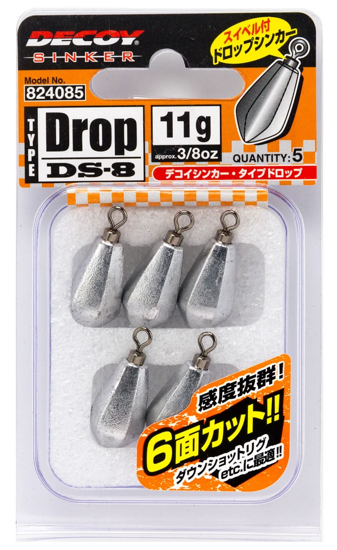 Combining high sensitivity, castability, and snagless performance, the Decoy DS-8 Drop Casting Sinker features a 6-sided hexagonal shape that suppresses rolling and provides the angler with incredible feel and improved hold on the bottom. Made from a highly dense lead compound, this drop-type sinker provides tons of sensitivity and makes it easy to understand the type of bottom sediment that is present. Built with a flexible swiveling line tie to prevent line twists, the Decoy DS-8 Drop Casting Sinker is perfect for all kinds of offshore fishing techniques including drop shots, free rigging, and punch shot systems.